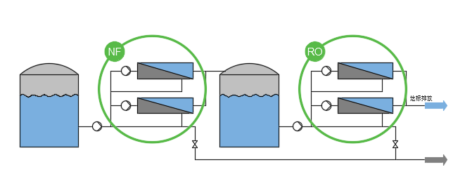 納濾和反滲透一體化撬裝設(shè)備用于垃圾滲濾液的處理中時,應(yīng)置于預(yù)處理及生化處理之后,常見的處理流程為:預(yù)處理+生化處理+MBR+納濾+反滲透